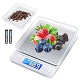 • 👍9 WÄGEINHEITEN KONVERTIERT -- Feinwaage genaue messungen.Großem LCD-Display,9 Wägeeinheiten:g / ct / dwt / ozt / oz / gn / lb / tl / ml.Große Auswahl an Anwendungen: Lebensmitteln,Schmuck,Milch,Medikament,Getreide usw.Edelstahl Oberfläche,und Kommt mit zwei ABS-Kunststoff Tabletts,Verwendung sicherer.(digital küchenwaage entsprechen CE zertifiziert)