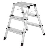 - SICHER & STABIL: Die Trittleiter hat 3 extra breite Stufen (30 x 20 cm) mit schwarzen Anti-Rutsch-Matten und verfügt übder gummierte Füße sowie ein Sicherheitsverriegelung für besonders hohe Standsicherheit.
